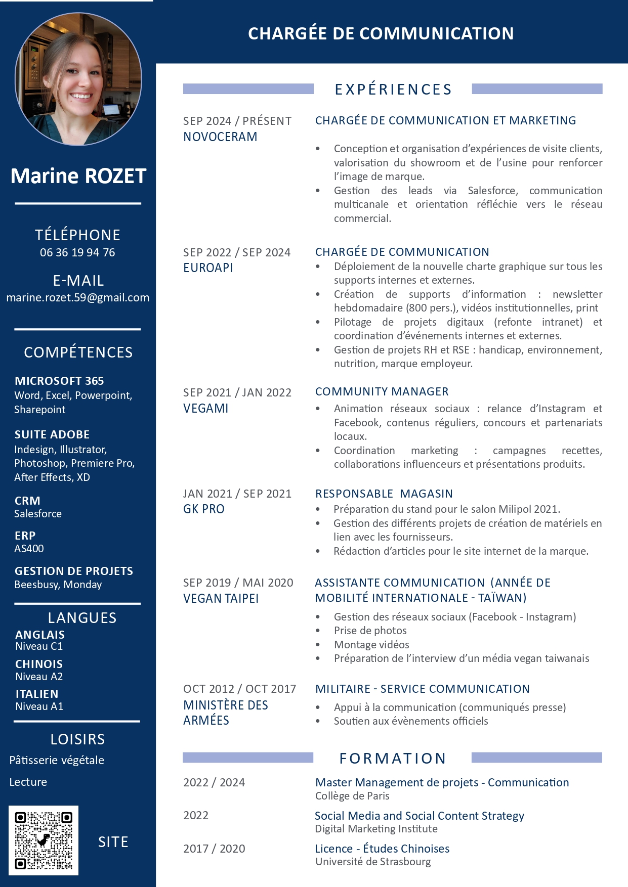 Diplômée d’un master en communication digitale, j’ai travaillé sur des projets variés : newsletters, intranet, vidéos, campagnes RH, événements internes. Mon approche est structurée, créative et orientée humain. Je combine stratégie, contenu et coordination pour donner vie à des projets utiles et cohérents.